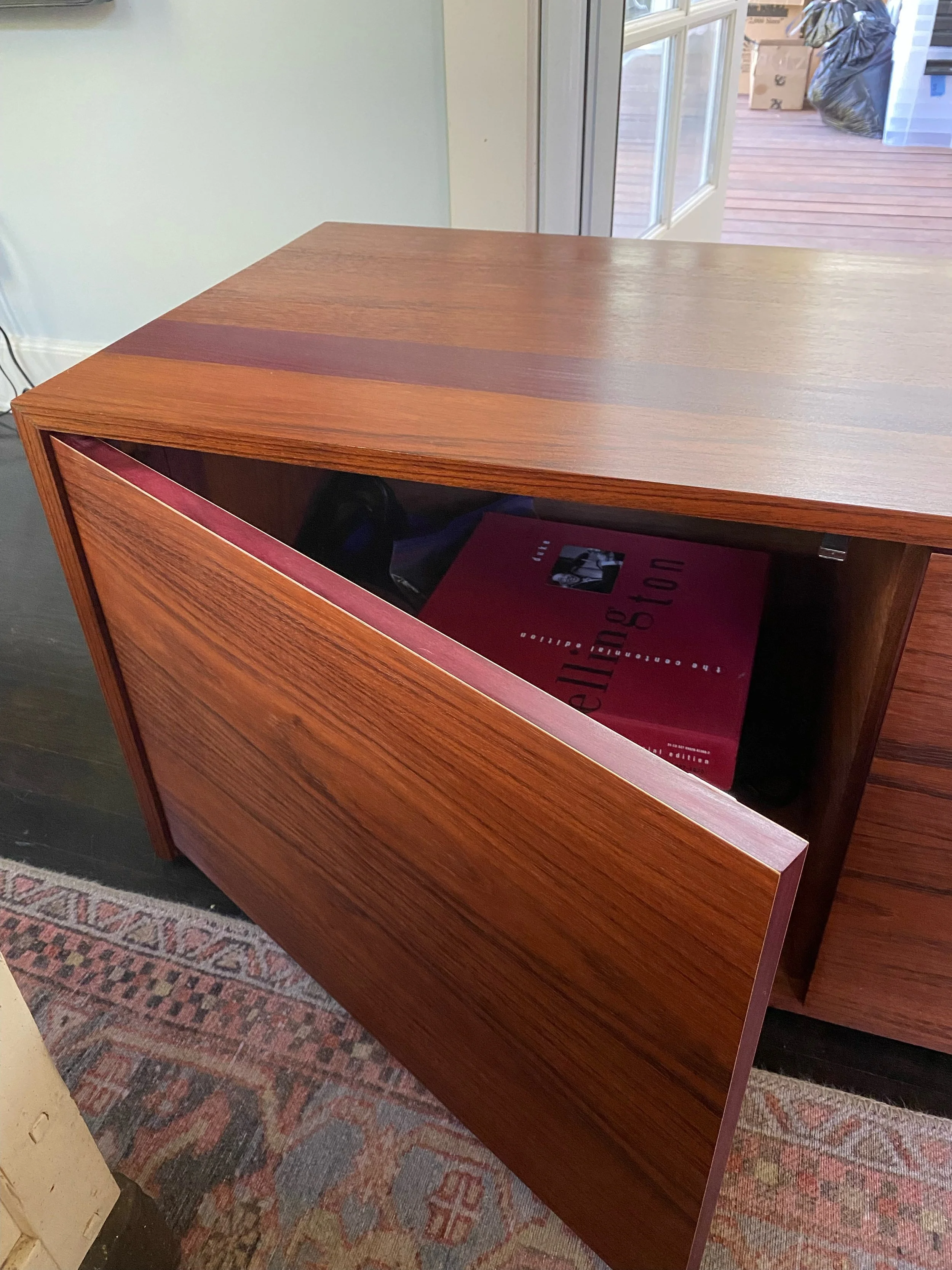 Sometimes living in a huge loft can make decorating the walls a tad difficult. The solution for this client was to work their storage needs into artisan cabinets. This cabinet set needed to provide office and home entertainment storage, provide functional and mood lighting and be movable if the owner ever wanted to relocate them (which they did when they moved). Six pieces in total, made of Jatoba and Purple Heart hardwood species. These pieces were designed to complement the risers on the staircase opposite them. They rest an inch off the wall on french cleats to appear as if they are floating. To support the open airy feeling of the space, half the cabinets were left open without doors. The wood tones match and collaborate with the existing furnishing, decor, and wood grains currently existing in the home. The final product was more than a place to store pencils and video consoles, its presence warms and enriches this home as a wall hanging sculpture installation.